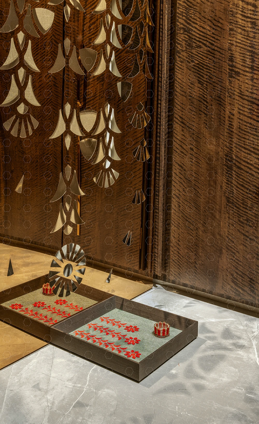 Now available as a screen, Ābhā transforms spaces with its striking presence, reaching up to 8×4 feet in stone or sheet metal. Whether as a functional element or an artistic statement, Ābhā unites space and soul, bringing an air of cultural richness and timeless elegance to any setting.