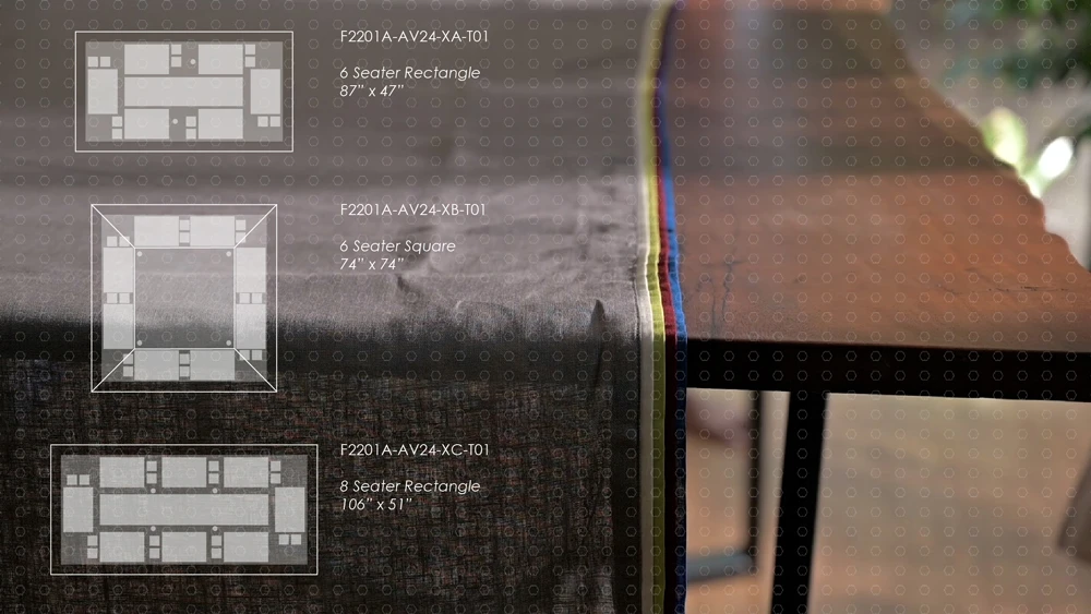 6 Seater Rectangle: 87"(Length) x 47"(Width) 8 Seater Square: 74"(Length) x 74"(Width) 8 Seater Rectangle: 106"(Length) x 51"(Width) |